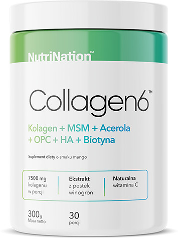 Collagen6™ to innowacyjny suplement diety, stworzony specjalnie dla osób dbających o zdrową i piękną skórę. Jego zaawansowana formuła składa się z wysokiej jakości składników, takich jak hydrolizat kolagenu, organiczna siarka, ekstrakt z winogron, biotyna, ekstrakt z aceroli z naturalną witaminą C oraz kwas hialuronowy. To kompleksowe połączenie składników działa na wielu poziomach, wspierając odnowę i rewitalizację skóry.